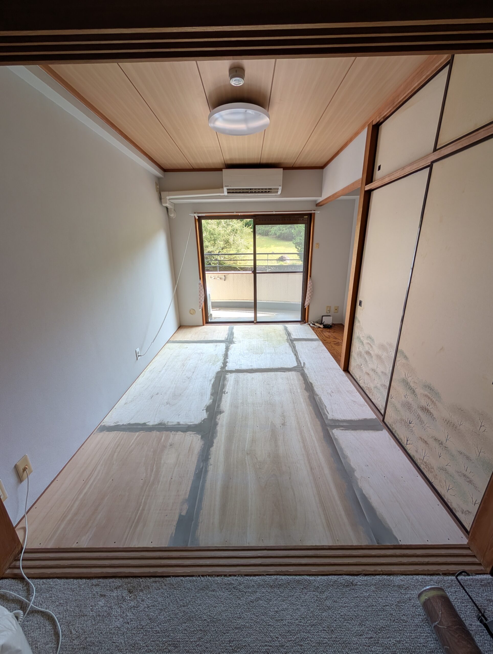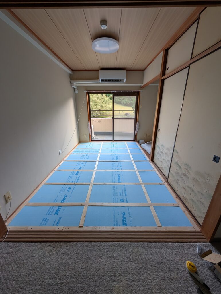 畳を撤去後コンクリートの床に根太を取り付けました。